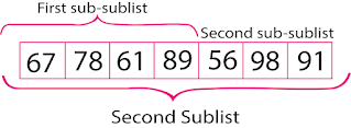 The first sublist will be sorted faster than the second sublist because the length of the first sublist is a small value. The first sublist sorted way will be like this,